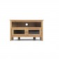 Fitting neatly into the corner of your room to maximise floor space, there’s no need to compromise on the size of your TV as this unit is 95cm wide. Offering plenty of curve appeal in its simple Shaker-inspired design, its retro feel will look good in both traditional and modern decors. Built to last from oak and oak veneers which have been treated to a wax lacquer that brings up the grain beautifully, it has a shelf for your digital receiver and a spacious cupboard with shelf to store away DVDs, spare cables, gaming handsets and other related bits and pieces. We’ve shown it with small wooden handles but you also get a set of vintage-style brass-effect handles if you want to give it a different look.